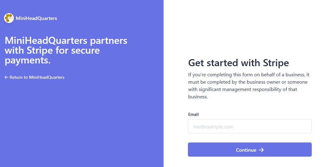 Depending on the choices you will make, you will have to provide some information. In case of difficulty, do not hesitate to contact MiniHeadQuarters' support, which will eventually redirect you to Stripe's support if needed.