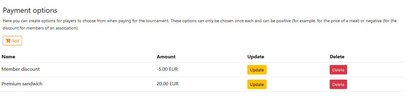 This feature allows you to set registration options that can be selected by users during tournament checkout. This allows you to define for example discounts or surcharges.