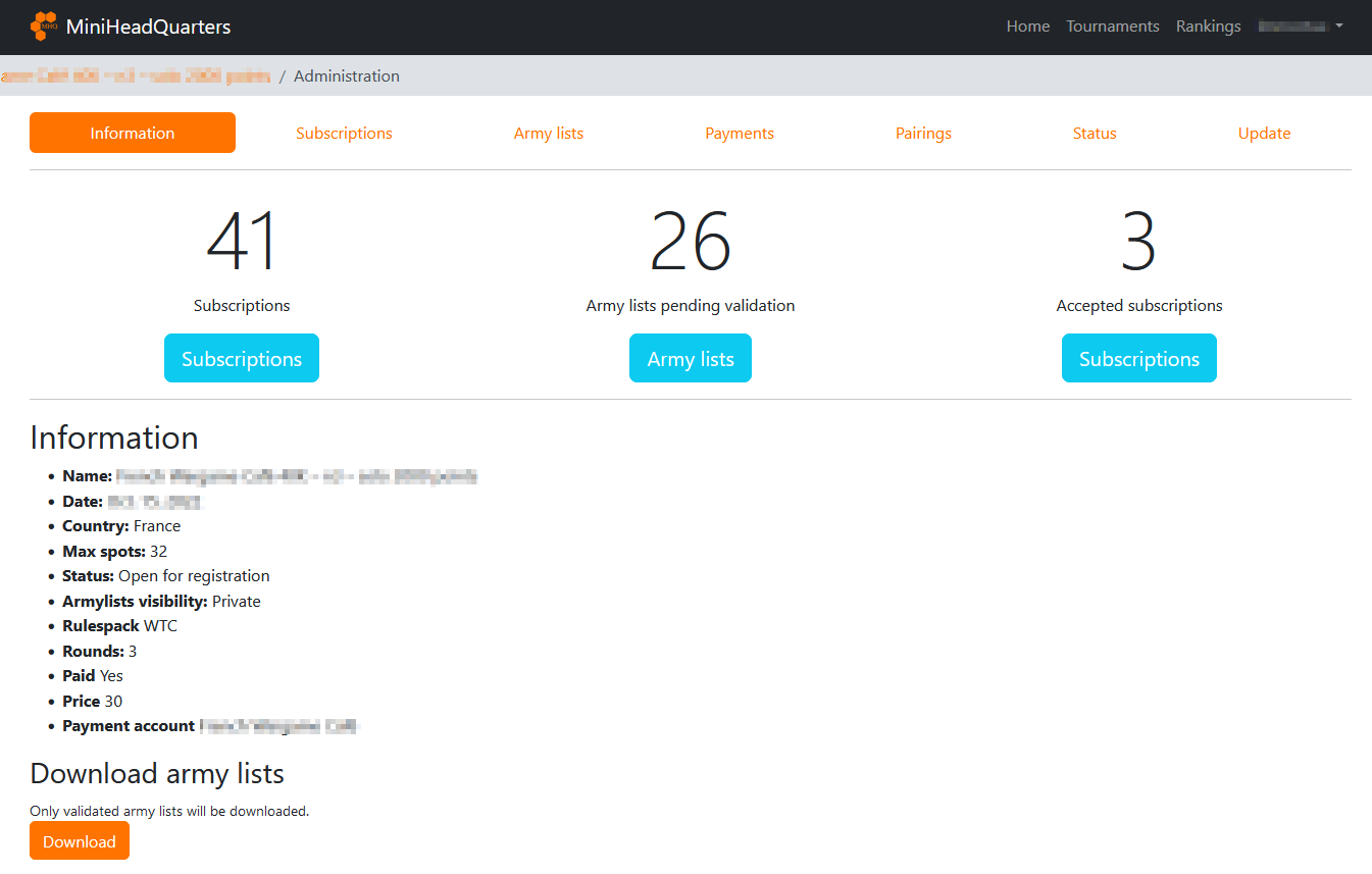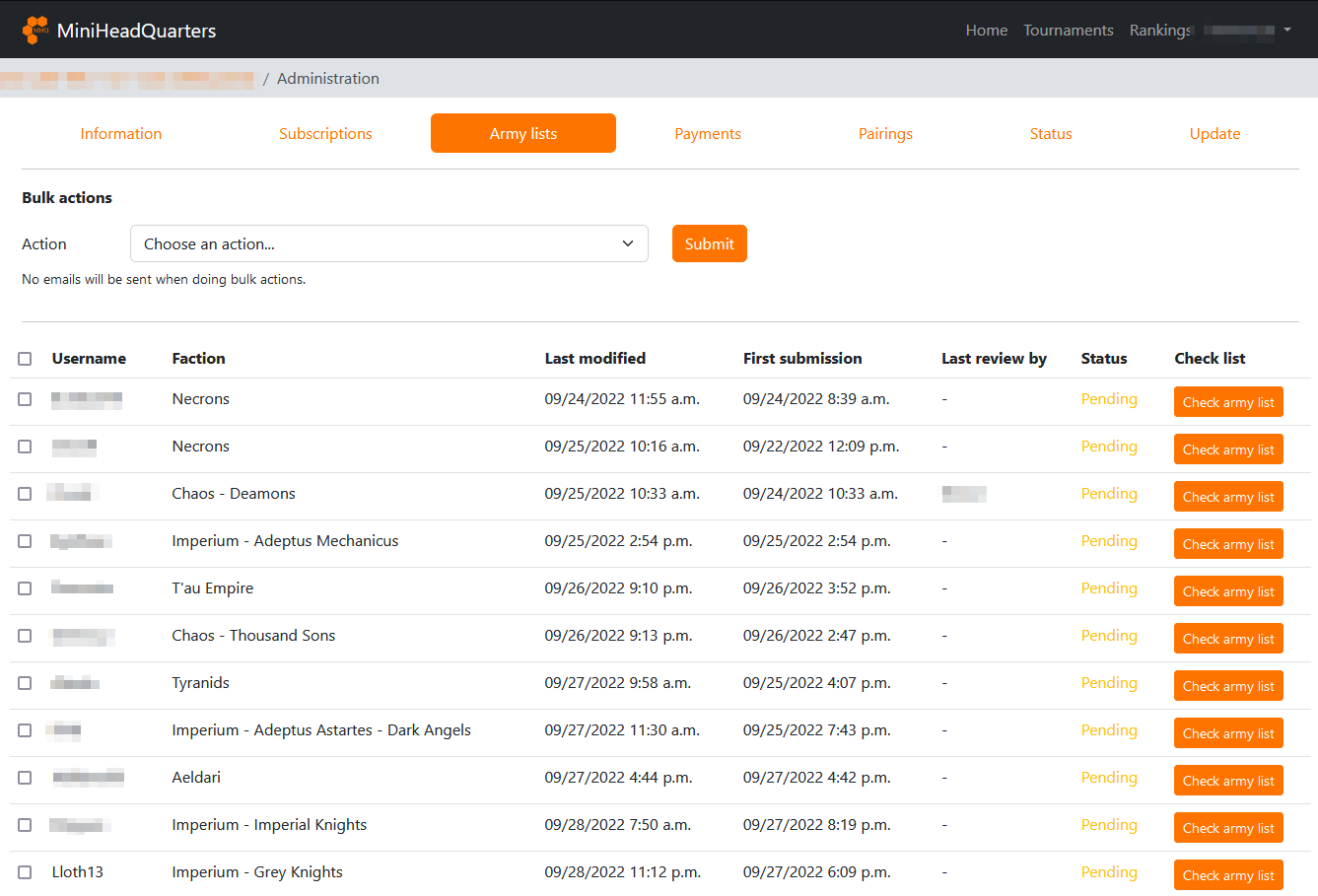 In the Army lists tab, you can manage army lists validation.