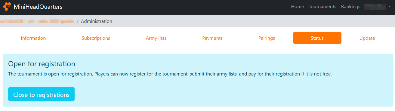 Status tab is where you can change your tournament status, to open it to registration, close it, or set it as finished.