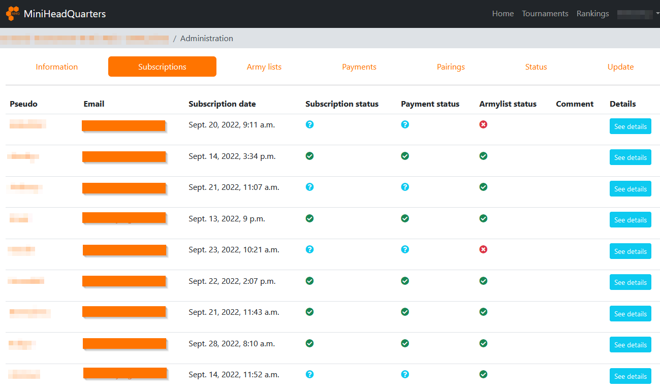 The following information is present: player's nickname (or captain's nickname for side-by-side and team tournaments), player's (or captain's) email, registration date, status (more information below), a possible comment and finally a button to access the registration details.