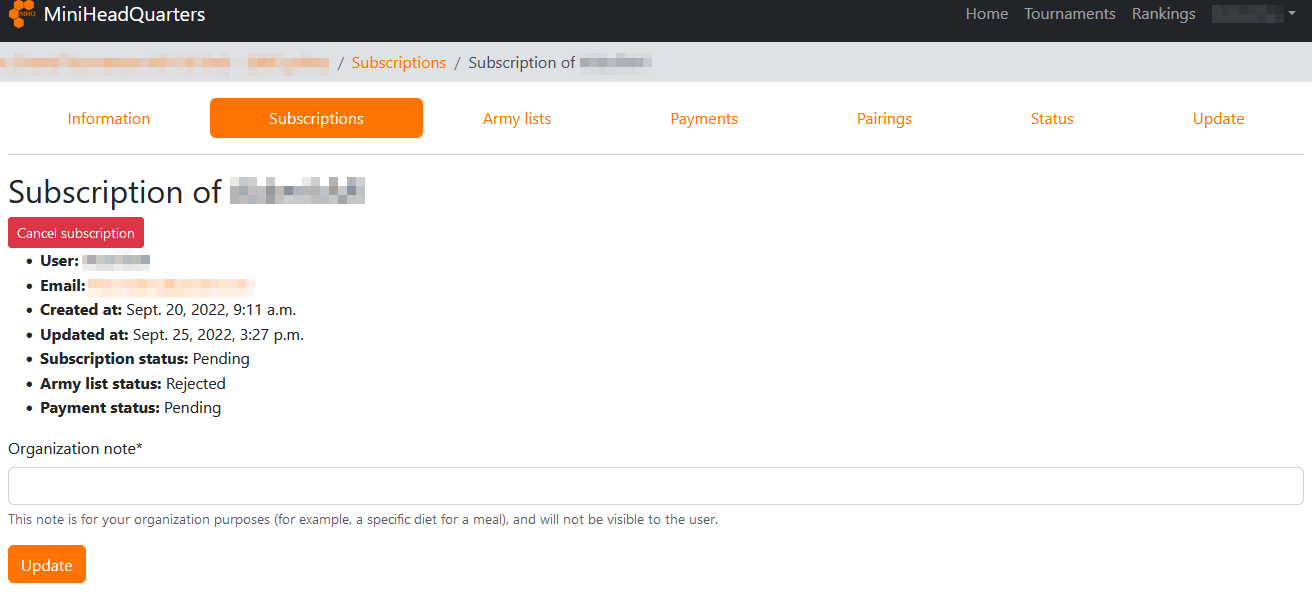 Each registration on MiniHeadQuarters has a Status. This global status depends on two sub-status: the status of the list (or lists for side-by-side and team tournaments) and the status of the payment.
